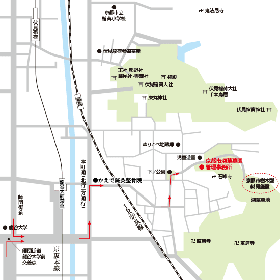(京阪本線「龍谷大前深草」駅から徒歩7分、JR奈良線「稲荷」駅から徒歩8分)