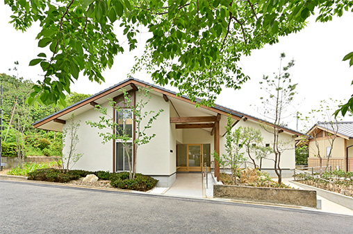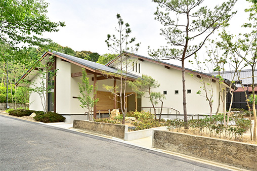 京都産木材や瓦などを使用した、落ち着きと温かみのある外観・内装。建物周りの植栽は京都の庭園や里山をイメージ。