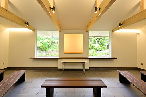 祭壇の大きな窓は、納骨堂及び樹木型納骨施設の方角(東)を向いています。